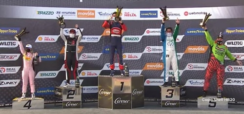 Os dois pilotos de Campo Mourão que disputam a Copa Shell HB20 subiram ao pódio neste sábado, na primeira corrida da etapa de Goiânia. Na categoria Elite, Pedro Perdoncini largou em segundo e chegou em quarto. Na Super, Thaline Chicoski largou na pole (de novo) e também chegou na quarta posição (foto). A segunda corrida de Goiânia é neste domingo (11h30), com transmissão na Bandsports.