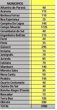 Onde? - Araruna 39, Barbosa Ferraz 13, Boa Esperança 9, Campina da Lagoa 93, Corumbataí do Sul 4, Engenheiro Beltrão 5, Fênix 2, Goioerê 53, Iretama 32, Janiópolis 4, Juranda 26, Luiziana 29, Mamborê 9, Moreira Sales 36, Nova Cantu 30, Peabiru 16, Quarto Centenário 4, Rancho Alegre do Oeste 7, Roncador 35, Terra Boa 6 e Ubiratã 59.