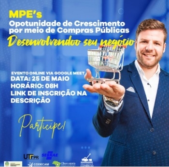 A importância da participação de micro e pequenas empresas em licitações de compras públicas. Esse é o tema de evento online que o Conselho de Desenvolvimento de Campo Mourão vai realizar na terça-feira (8h). Será em parceria com o Seabre, UTFPR, prefeitura e Observatório Social.