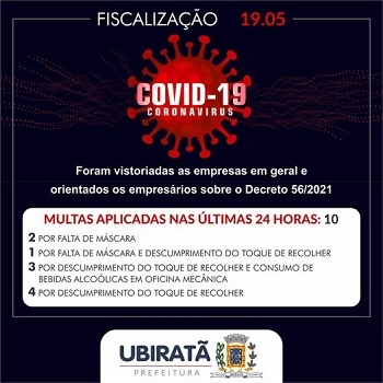 Depois dos boletins com dados da covid e da vacinação, a prefeitura Ubiratã agora publica nas redes sociais o balanço da fiscalização das medidas de combate ao coronavírus. Nesta quarta-feira, por exemplo, foram 10 multas, seja por falta de máscara, por descumprir toque de recolher ou descumprimento da lei seca.