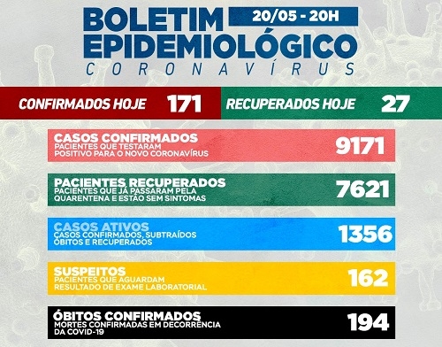 A quinta-feira teve mais 171 casos confirmados de covid-19. O número de moradores com o vírus ativo subiu para 1.356. E foram confirmadas mais duas mortes (26 apenas este mês).