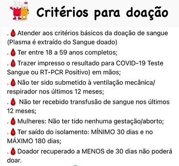 O Hemonúcleo de Campo Mourão está com campanha de doação de sangue visando a produção de plasma convalescente para ser usado em pacientes com covid-19. O doador precisa já ter tido a covid-19 e se curado há mais de um mês. As regras estão no quadro acima. Interessados em doar podem agendar por telefone ou internet: