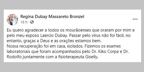 Regina Dubay, ex-prefeita de Campo Mourão, em postagem em redes sociais em que se manifestou publicamente, pela primeira vez, depois que contraiu a covid-19. Ela ficou isolada em hotel em São Paulo, mas o marido Laércio Dubay necessitou de internação hospitalar.