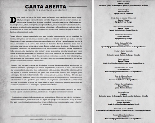 Quinze pastores evangélicos de Campo Mourão assinaram uma "Carta Aberta" divulgada nesta segunda-feira.