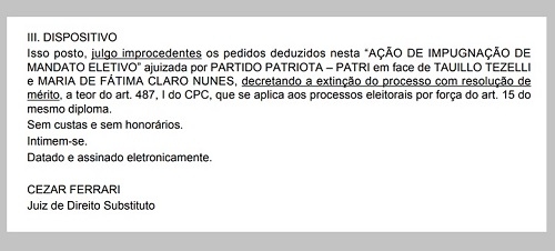 A Justiça Eleitoral julgou improcedente ação de impugnação de mandato do prefeito de Campo Mourão, Tauillo Tezelli.