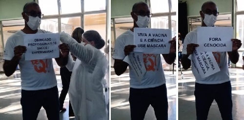 Em tempos de vacina contra pandemia, se tornou comum pessoas darem seus recados na hora da imunização. Em Campo Mourão, o professor Valdair Silva (diretor do Colégio Estadual), não conseguiu dizer tudo o que queria numa folha só, não. Mostrou três enquanto era vacinado. Agradeceu aos profissionais de saúde, enalteceu a saúde e a ciência, pediu o uso de máscaras e terminou com o "fora genocida"...
