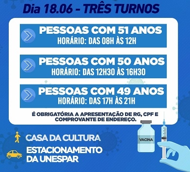 A Secretaria de Saúde de Campo Mourão ampliou a faixa etária da vacinação contra a covid para esta sexta-feira. Agora vai até 49 anos. Começa com quem tem 51 anos, das 8h às 12h. Depois vem o pessoal com 50 anos (das 12h30 às 16h30) e com 49 anos (das 17h às 21h). Em tempo: tem de levar RG, CPF e comprovante de endereço.