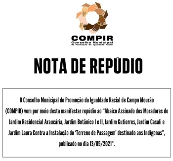 Lembra que moradores do jardim Araucária e bairros vizinhos iniciaram abaixo-assinado online contra "terreno de passagem" anunciado pela prefeitura de Campo Mourão? O Conselho Municipal de Promoção da Igualdade Racial divulgou nota de repúdio a essa iniciativa. O terreno é para o uso de indígenas durante estadia na cidade.