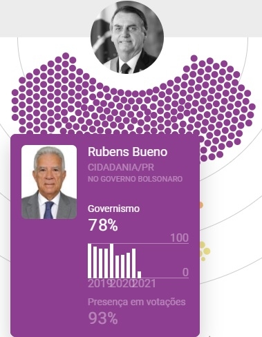O deputado federal Rubens Bueno, ex-prefeito de Campo Mourão, tem feito críticas pesadas ao presidente Jair Bolsonaro, mas vota quase sempre a favor das pautas do governo. É o que diz o "Radar do Congresso" do portal Congresso em Foco. Levantamento diz que Bueno votou com o governo 78% das vezes. A média geral é 76%. Na bancada do Paraná o índice médio é de 79%.
