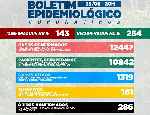 Campo Mourão confirmou mais 143 casos de covid-19 nesta terça-feira. Os recuperados foram 254. O número de moradores com o vírus ativo caiu para 1.319. Os casos suspeitos subiram de 79 para 161. Também foram confirmadas mais duas mortes (agora são 68 em este mês). Na ala covid há 73 pessoas internadas, sendo 42 na UTI. De Campo Mourão, são 14 na enfermaria e 22 na unidade de terapia intensiva).