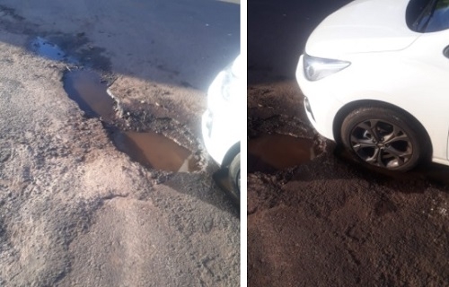 "Morador de Goioerê quebrou a roda de seu carro em buraco na av. Moisés Lupion, no centro, ao sair de posto de combustível. Que vergonha para o município. Morador vai acionar a prefeitura para ressarcir o prejuizo".