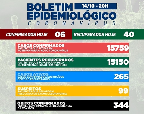 Campo Mourão teve seis casos de covid-19 confirmados nesta quinta-feira. Os recuperados foram bem mais: 40. Assim, o número de moradores com o vírus ativo caiu para 265. A má notícia do dia foi a confirmação de duas mortes - um homem de 74 e outro de 32 anos. A taxa de ocupação de leitos ficou em 31% na enfermaria e 25% na UTI SUS. As internações são 12, sendo seis na UTI.