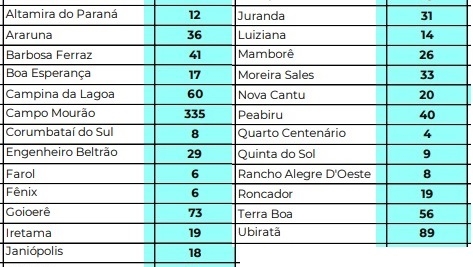 Boletim diário da Secretaria de Estado da Saúde mostra algumas cidades da região com mais mortes por covid-19 do que os boletins das secretarias municipais. Campo Mourão é uma delas. Tem 332 óbitos no boletim local e 335 no estadual. Goioerê tem dois a mais (73 a 71) e Terra Boa três (56 a 53). A maior diferença ocorre em Ubiratã: sete mortes a mais (89 a 82). Em Altamira do Paraná, Engenheiro Beltrão e Peabiru a diferença é de um óbito.