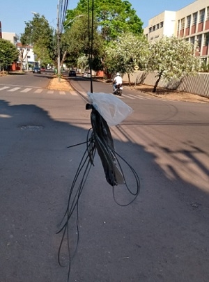 Os fios soltos pelos postes continuam em Campo Mourão. Na av. Guilherme de Paula Xavier, esquina do Colégio Estadual, alguém fez a boa ação deixar tudo ao menos sinalizado.