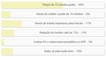 "O que poderia melhorar na Zona Azul de Campo Mourão?" Enquete com essa pergunta foi encerrada neste domingo. Venceu, com folga, a alternativa "Tempo de 15 minutos grátis", com 50% dos votos. "Venda de tickets impressos pelos fiscais" teve 17%. "Redução do horário (até às 17h)" ficou com 11%. Já para 10% não precisa mudar nada, "já está bom assim". O resultado completo está no quadro acima.