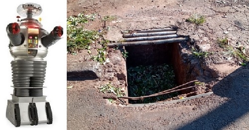 Bueiro escancarado na rua João Vecchi, na entrada do Lar Paraná. Os sensores do Robô foram acionados, indicando perigo para pedestres que passam, principalmente à noite, pelo local.