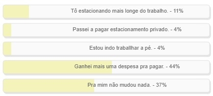 O que mudou na sua vida com o início da Zona Azul? Enquete com essa pergunta foi encerrada neste domingo. "Ganhei mais uma despesa pra pagar" foi a alternativa mais votada, com 44%. "Pra mim não mudou nada" veio logo atrás, com 37%. Outros 11% disseram que estão estacionando mais longe do trabalho, 4% estão indo trabalhar a pé e 4% passaram a usar estacionamento privado.