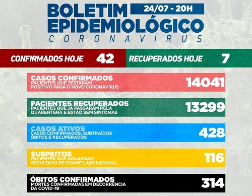 Mais 42 casos de covid-19 foram confirmados neste sábado em Campo Mourão. Os recuperados foram apenas sete e o número de moradores com o vírus ativo subiu para 428 (tinha caído para 349). Também foi confirmada uma morte e agora são 26 este mês. Pelo segundo dia seguido a UTI SUS não ficou lotada (índice de 83%). Na UTI convênio a taxa de ocupação de leitos é de 40% e na enfermaria 121%.