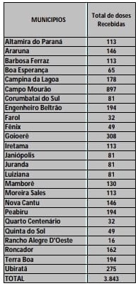 Campo Mourão fica com 897 para a dose inicial e 1.680 para a dose final.