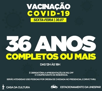 Moradores de Campo Mourão com 36 anos completos (ou mais) poderão tomar a primeira dose da vacina contra a covid-19 nesta sexta-feira. Será das 12h às 18h na Casa da Cultura e Unespar. A Secretaria da Saúde informa que serão atendidas até 1.050 pessoas por ordem de chegada.