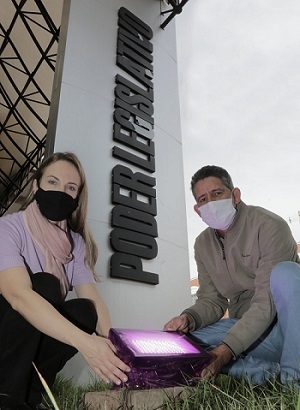 O presidente da Câmara de Campo Mourão, Jadir Pepita, e a vereadora Naiany Salvadori instalaram nesta quinta-feira um material plástico lilás nas luminárias do prédio do Legislativo. Foi em alusão ao Agosto Lilás, que chama a atenção para a campanha contra a violência doméstica que atinge as mulheres.