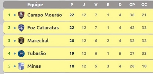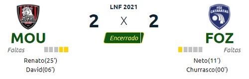 Campo Mourão e Foz do Iguaçu empataram em 2 a 2 nesta quarta-feira pela Liga Nacional de Futsal. O jogo foi disputado no Ginasião. Detalhe: o time do oeste abriu o placar logo aos 11 segundos. As duas equipes foram a 23 pontos, mas Campo Mourão lidera o grupo C pelo saldo de gols. Para encerrar a primeira fase, resta ao Carneirão apenas o confronto contra Minas, segunda-feira, em Belo Horizonte.