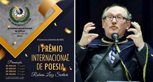 A Academia Mourãoense de Letras lançou nessa sexta-feira, o 1.o Prêmio Internacional de Poesias Rubens Luiz Sartori. O tema é livre, a participação é gratuita e o evento será todo online. Haverá premiação em dinheiro - R$ 1,9 mil - para as melhores poesias e interpretações (em vídeo). O nome do prêmio é uma homenagem ao promotor e primeiro presidente da AML, Rubens Luiz Sartori, que morreu em 2013.
