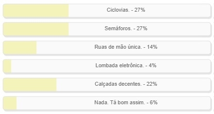 "Agora que saiu a Zona Azul, o que falta para Campo Mourão?" Enquete com essa pergunta foi encerrada neste domingo. Resultado? Empate na primeira colocação. "Ciclovias" e "Semáforos" tiveram 27% dos votos cada. "Calçadas decentes" completou o pódio, com 22%. O resultado completo está no quadro acima.