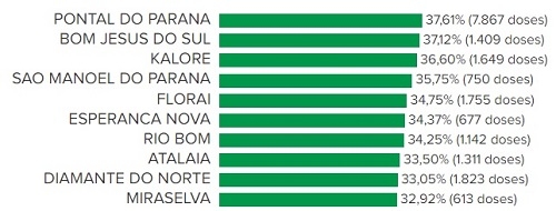 Farol é a cidade da região que, proporcionalmente, mais vacinou a população com as duas doses da vacina contra a covid-19. É o que mostra o "Ranking da vacinação" da Secretaria de Estado da Saúde. O município está com 29,38% dos moradores imunizados. Depois vêm Janiópolis (28,26%) e Quinta da Sol (26,04%). A média do Paraná é 22,66%.