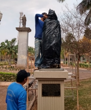 Foi colocada nesta quarta-feira, na praça São José, a estátua do bispo d. Mauro Aparecido dos Santos. Ela está encoberta e só será inaugurada em celebração no próximo domingo (9h30). D. Mauro foi o terceiro bispo de Campo Mourão. Os dois primeiros já têm estátuas no mesmo local. A celebração marca os 23 anos da apresentação canônica de d. Mauro em Campo Mourão. Ele morreu em março deste ano, vítima de covid-19.