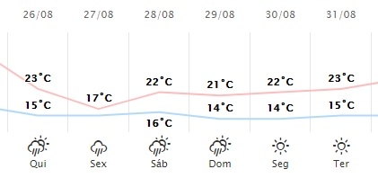 Tá calor, né? Segundo o Simepar, a máxima nesta quarta-feira chegou a 33,5°C em Campo Mourão. Na região, a temperatura foi ainda maior em Ubiratã (34,6°C). A previsão para quinta-feira é de temperaturas mais amenas. Máxima de 23°C em Campo Mourão, com pacandas de chuva. Na sexta chove e o termômetro não passa dos 17°C.