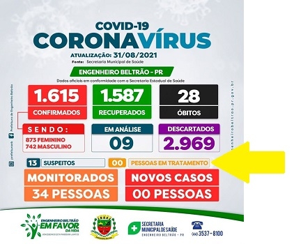Substituição na relação das cidades da região que estão sem casos ativos de covid-19. Saem Janiópolis e Juranda, que voltaram a registrar moradores com a doença, e entra Engenheiro Beltrão, que "zerou" nesta quarta-feira. O município já teve, desde o início da pandemia, 1.615 casos de covid-19, sendo que 1.587 se recuperaram e 28 morreram. Seguem zerados Farol e Moreira Sales.