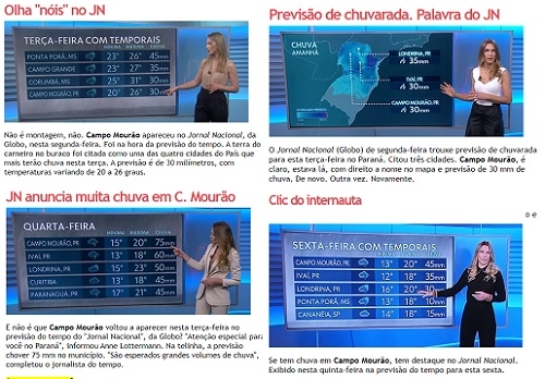 Campo Mourão aparecer na previsão do tempo do Jornal Nacional (Globo) virou carne de vaca. Tão comum como a previsão dar errada. Na quinta-feira, por exemplo, o JN previu 45 mm de chuva para o dia seguinte. Resultado? Não choveu quase nada. Foi a terceira vez seguida que o telejornal erra feio na previsão para o município. Ah, já dá para pedir música no Fantástico...