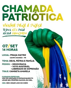 Apoiadores do presidente Jair Bolsonaro estão organizando manifestações por todo o País no feriado de 7 de setembro. Em Campo Mourão a mobilização será na praça São José, a partir das 14h. Divulgação que corre pelas redes sociais frisa que o tema será "Deus, pátria e família" e os pedidos são por "democracia, voto auditável e liberdade de expressão".
