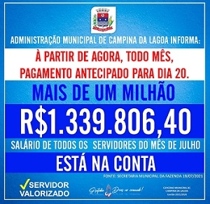 A partir de agora os servidores municipais de Campina da Lagoa vão receber os salários sempre no dia 20.