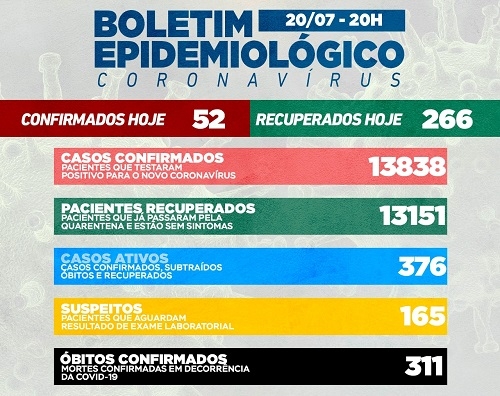 Campo Mourão teve 266 pessoas recuperadas da covid-19 nesta terça-feira. Os novos casos foram 52. Com isso, houve queda grande no número de moradores com o vírus ativo - de 591 para 376. De ruim, a 23ª morte em julho e o aumento de 89 para 165 nos casos suspeitos. Taxa de ocupação de leitos: 100% na enfermaria, 112% na UTI SUS e 50% na UTI convênios.