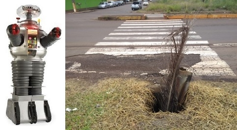 Tem um bueiro aberto, em frente à rodoviária de Campo Mourão. E bem na passagem da faixa de pedestre! Alguém se preocupou e "sinalizou" com um galho de palmeira. Aqui na Boca Santa os sensores do Robô foram ativados e alertaram para o perigo.