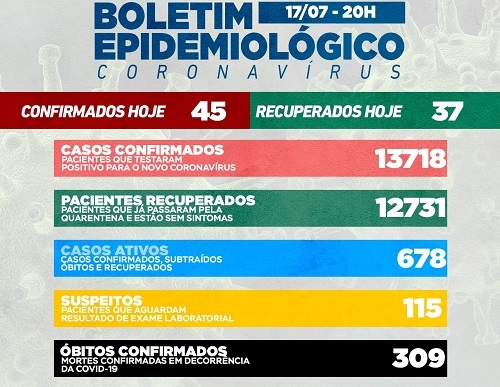 Mais 45 casos de covid-19 foram confirmados em Campo Mourão neste sábado. Os recuperados foram 37. Ou seja, o número de moradores com o vírus ativo subiu e foi a 678. Confirmada também mais uma morte, a 21.a deste mês. O número de suspeitos caiu de 190 para 115. Na ala covid subiram para 58 as internações. Taxa de ocupação de leitos: 105% na enfermaria, 125% na UTI SUS e 40% na UTI convênios.