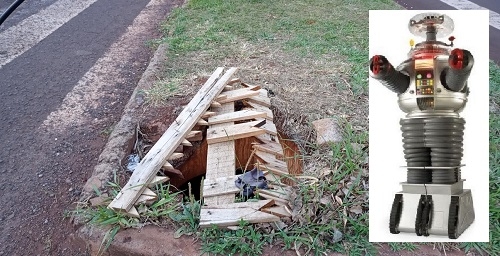 Flagra em frente ao posto de sáude do jardim Paulista. Uma espécie de bueiro (só que fundo, deve ter uns 2 metros ou mais) sem tampa, com o agravante que está próximo à travessia de pedestres, no canteiro central. Difícil saber o que é pior: o buraco ou a sinalização precária, com pedaços de madeira pontiagudos e pregos expostos.