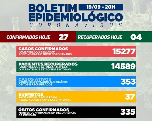 Campo Mourão registrou 27 novos casos de covid-19 neste domingo. Os recuperados foram 4 e o número de vírus ativo foi para 353. Também foi confirmada uma morte (homem de 81 anos), a terceira deste mês. Taxa de ocupação de leitos: 31% na enfermaria, 66% na UTI SUS e 20% na UTI convênios.