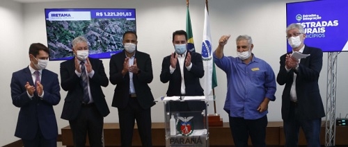 O governador Ratinho Jr assinou nesta terça-feira convênios para mais 54,27 km de pavimentação com pedras irregulares em estradas de 14 municípios. Um deles é Iretama, que vai receber R$ 1,2 milhão para 3,9 km na estradas Vila Rural - Três Placas e Vila Rural - Esplanada. O prefeito Same Same esteve por lá. O deputado Douglas Fabrício também.