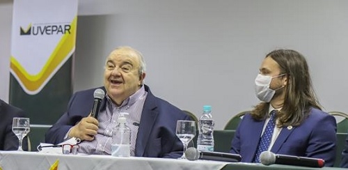 Rafael Greca, prefeito de Curitiba, ao participar, nesta quarta-feira, da abertura do 9.o Congresso de União e Fortalecimento da Vereança, promovido pela Uvepar, em na capittal do Estado. A entidade é presidida pelo vereador Fred Freitag, de Peabiru (na foto, à dir.).