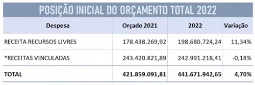 A prefeitura de Campo Mourão está tralhando com um orçamento para 2022 de R$ 441,6 milhões. Ou seja: 4,70% acima dos R$ 421,8 milhões previstos para este ano. Os números foram apresentados em audiência pública online realizada nesta quinta-feira.