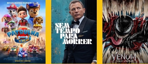 O filme "007 Sem tempo para morrer" estreia nesta quinta-feira no Cinemaxs, em Campo Mourão. Será na sessão das 19h30 (sala 2). No mesmo horário, na sala 1, segue em cartaz a animação "Patrulha Canina - O Filme" (todos pagam meia neste filme). E atenção! No dia 6, às 23h55, estreia "Venom: Tempo de Carnificina".