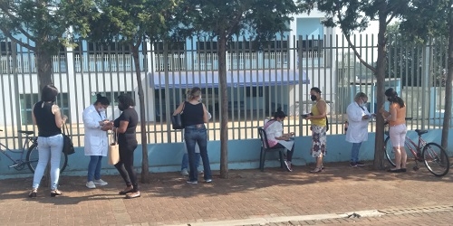 "Funcionários da Saúde de Campo Mourão ficam horas em pé no tempo, sem água fresca e mesa e cadeira, para trabalhar na triagem da vacina contra covid".