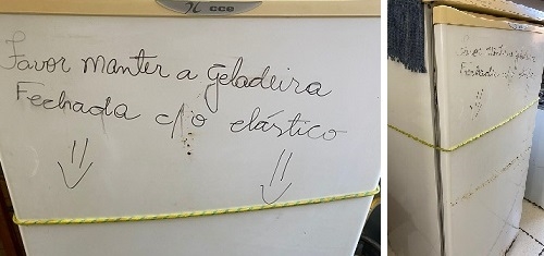 Uma geladeira com a porta fechada com um elástico. E o recado escrito à mão: "Favor manter a geladeira fechada com o elástisco". A foto é do Centro Social Urbano e foi mostrada pelo vereador Márcio Berbet na audiência pública de prestação de contas da Secretaria da Saúde de Campo Mourão, nesta quarta-feira.