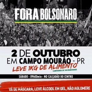 Foram marcados para este sábado, em todo o País, protestos contra o governo federal. Em Campo Mourão, partidos de esquerda, como PT, PSOL, PC do B e PDT, além de sindicatos e movimentos sociais marcaram mobilização a partir das 9h. Será no calçadão. "Por mais vacinas, emprego, auxílio emergencial digno e pelo fim do governo genocida de Bolsonaro", diz postagem em redes sociais.