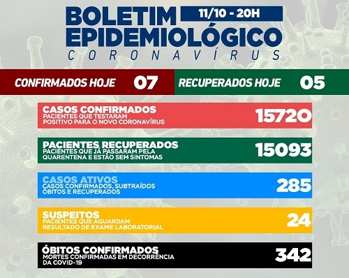 Véspera de feriados com sete casos de covid-19 confirmados em Campo Mourão. Os recuperados foram cinco. O número de casos suspeitos também está baixo: 24. Moradores com vírus ativo? 285. Taxa de ocupação de leitos: 42% na enfermaria e 37% na UTI SUS. São 17 pacientes internados, sendo nove na unidade de terapia intensiva.