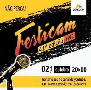 Acontece neste sábado o 41º Festival de Música da Arcam. Por causa da pandemia, nada de público presente, mas haverá transmissão ao vivo pelo canal da Coamo no Youtube. Vinte intérpretes foram selecionados entre os 47 que se inscreveram. A seleção de músicas vai de Zezé di Camargo e Benito de Paulta, de Fábio Jr a Jota Quest. Começa às 20h.