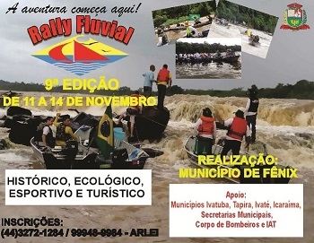 Fênix - A prefeitura confirmou a realização do Rally Fluvial do Rio Ivaí. Será de 11 a 14 de novembro. Vai até o Rio Paraná. Inscrições abertas pelo telefones (44) 3272-1284 ou 9 9948-9984 (Arlei).